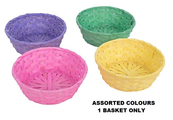 The basket is made from coloured woven bamboo and has slightly flared sides.