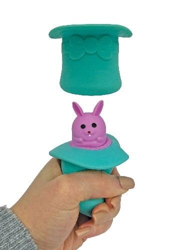 Squeeze the hat to see a bunny pop out - release your grip to see the bunny hide again!