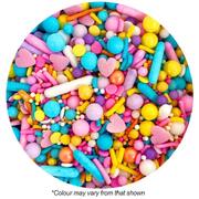 This 110 gram resealable bottle of edible sprinkles contain a mixture of pastel pink, blue, orange, yellow, white, purple balls, sequins, jimmies, hearts and rods.
