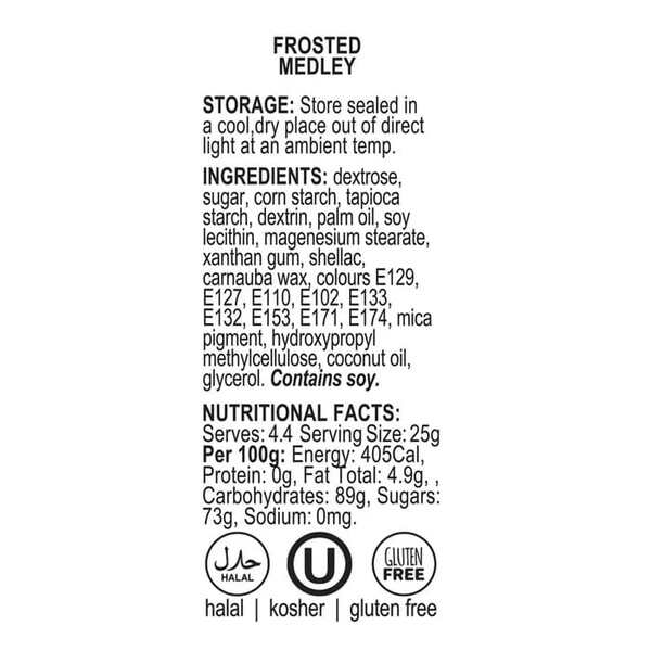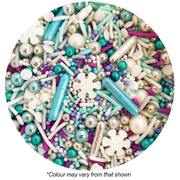 This 110 gram resealable bottle of edible sprinkles contains white snowflakes and a mixture of purple, blue, white, teal and silver balls, jimmies, sequins, stars and rods.
