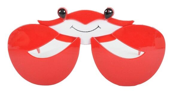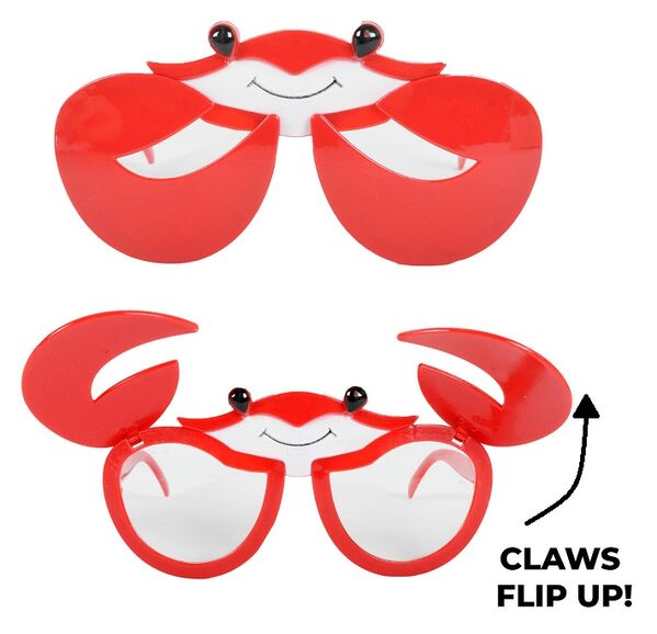 They feature a cute crab design with a smiling face and large red claws that flip up to reveal clear lenses underneath.