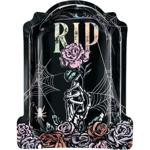 Pretty pastels and sweet roses mix with creepy spiders, skeleton hand and R.I.P. wording in these unusual tombstone-shaped plates - perfect for your Halloween or Spooky party table!