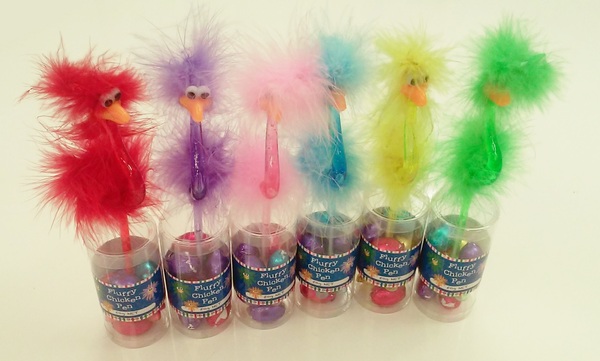 Assorted design fluffy chicken pens, each with 50g of mini chocolate Easter eggs, perfect for any Easter celebration!