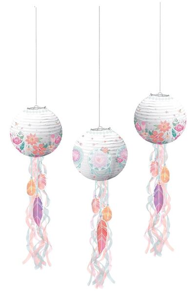 The pack includes 3 paper lanterns - 2 floral design, 1 dreamcatcher design - cardboard feathers and tissue paper tassels.