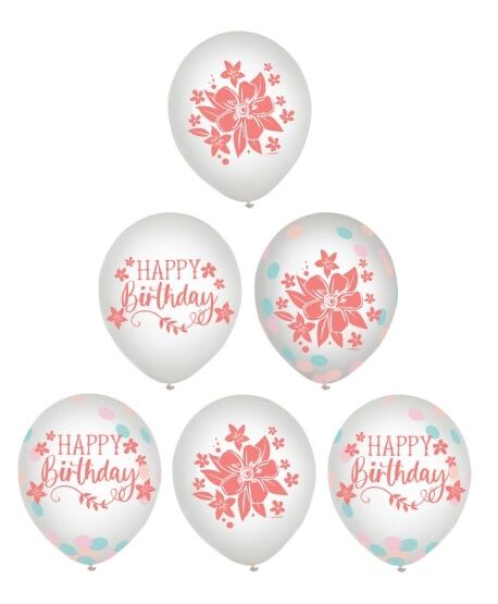 The pack contains 6 helium quality latex balloons with lovely floral and Happy Birthday designs - 3 of the balloons are pre-filled with pastel paper confetti.