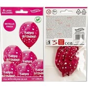The pack contains 6 latex balloons in fuchsia/hot pink with white 'Happy Birthday' and hearts print.