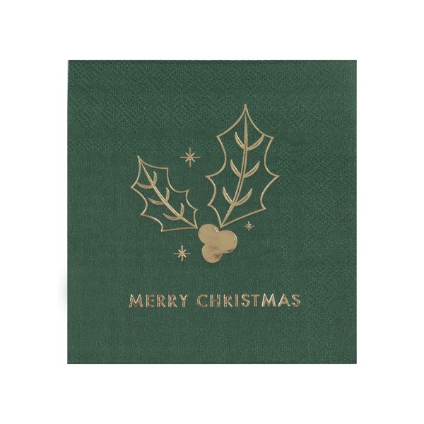 These elegant napkins feature a dark green background with gold foil 'Merry Christmas' wording & holly print.
