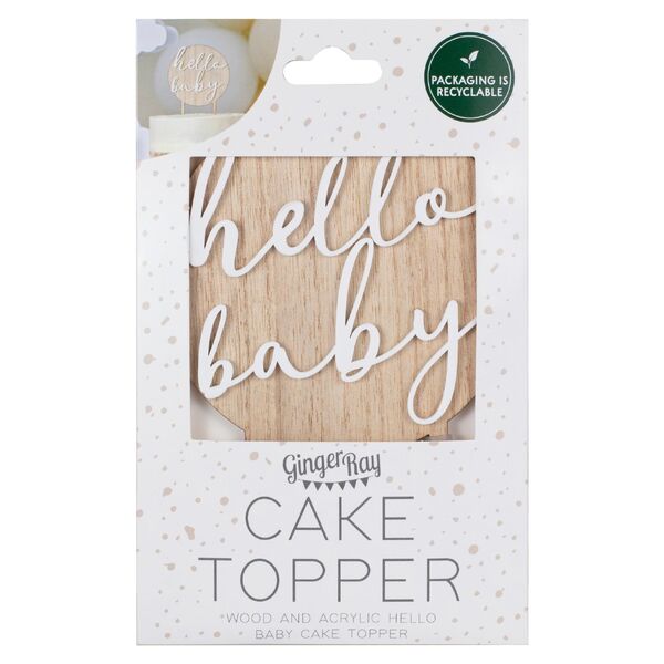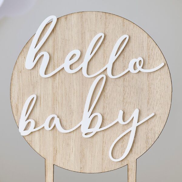The topper features a round wooden base & spikes with white acrylic 'Hello Baby' slogan.