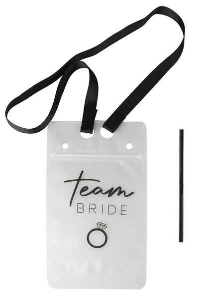 The pack contains 6 Team Bride drinking pouches, measuring 23cm (h) x 15cm (w), with black paper straw and black ribbon lanyard attached.
