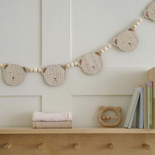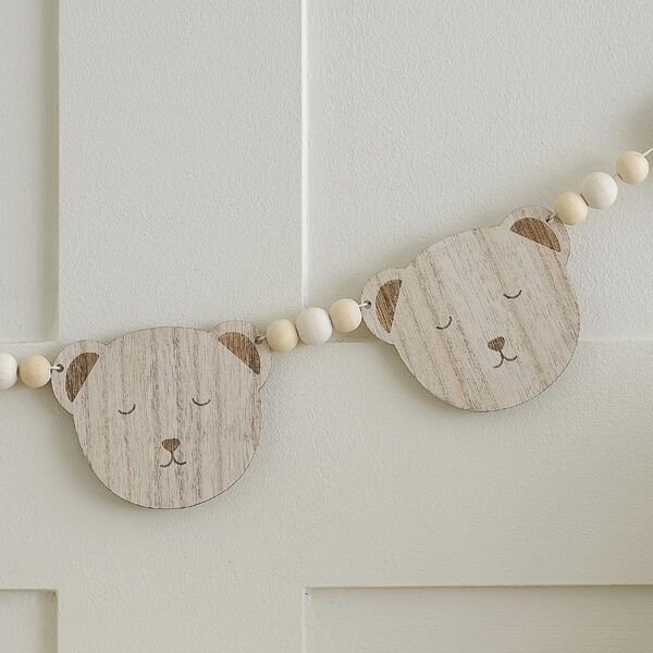 The bunting consists of 8 wooden sleepy teddy faces each measuring approx. 7.6cm (h) x 9.2cm (w) separated by white & natural wooden beads for a total length of approx. 1.5 metres.
