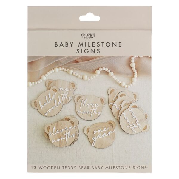 Each pack contains 13 wooden teddy bear shaped baby milestone signs with white acrylic lettering - one 'hello world' and one for each of the first 12 months.
