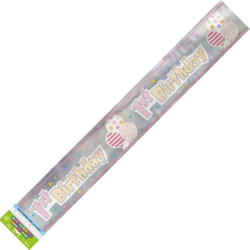 Girl 1st birthday foil banner, measuring approx. 12.5cm x 3.65m.