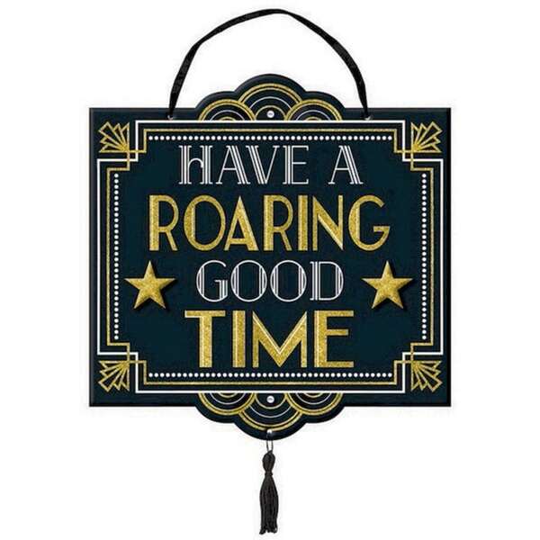 The words 'Have A Roaring Good Time' feature prominently in the centre and are surrounded by white and gold glitter borders.