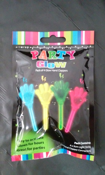 Pack of 4 glow hand clappers party favours. Pack contains: 4 x 5cm light sticks and 4 x hand clapper connectors.