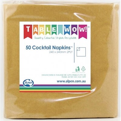 Pack of 50 gold 2 ply cocktail napkins - perfect for lots of different occasions! Each napkin measures approx. 12cm x 12cm (24cm x 24cm when folded out.)