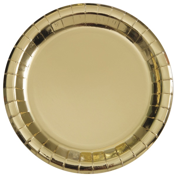 Pack of 8 gold foil paper plates. Each plate measures approx. 9in. (22cm) in diameter.