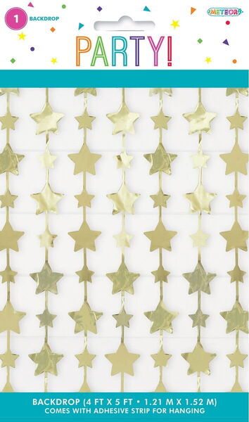 Strands of foil stars hang down from a top foil strip to create a shimmering gold curtain approx. 120cm wide x 150cm tall - perfect for adding extra sparkle to your party space.