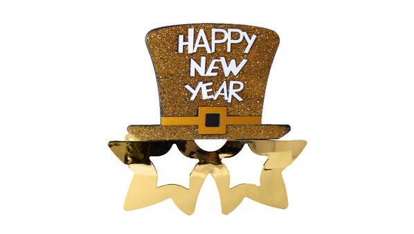 The plastic star-shaped frames have a metallic gold finish and feature a gold glitter top hat with 'Happy New Year' wording.