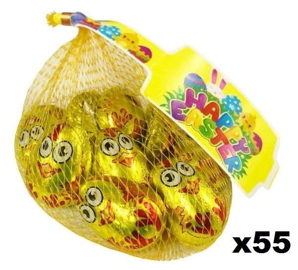 The mesh bag contains 70g of gold foil-covered milk chocolate chicks (9-10 pieces) - a delightful treat!