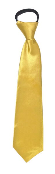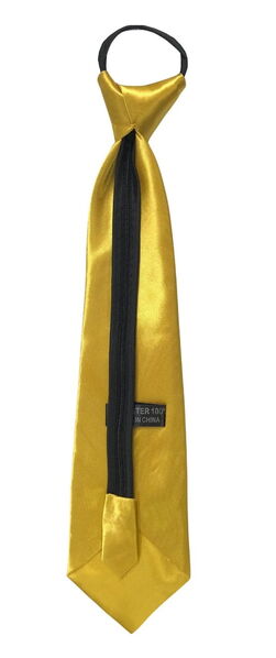 The tie is made from gold satin fabric and has an adjustable zipper closure around the neck.