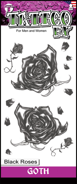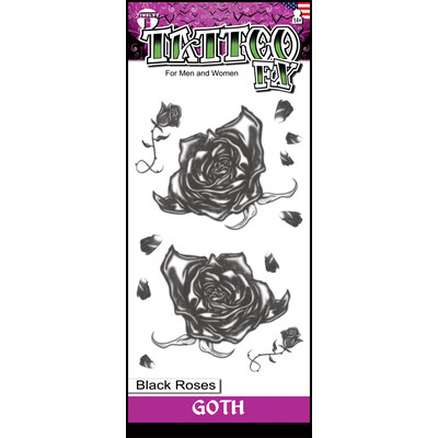 Gothic black roses temporary tattoos, perfect for a Halloween costume! Tattoos are assorted sizes and designs (shown in image.) Sizes range from approx. 1cm x 1cm to 7cm x 5.5cm.