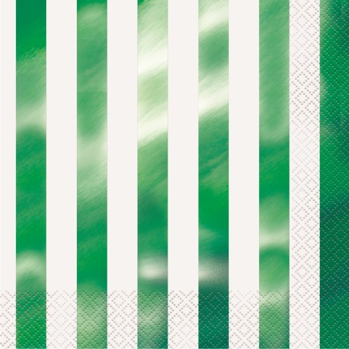 Pack of 16 green foil stripe 2 ply lunch napkins, each measuring approx. 16cm x 16cm (33cm x 33cm when folded out.)