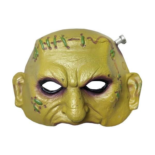 The mask is made from flexible moulded PU foam and features dramatic stitch detailing, pronounced facial features and a silver bolt in the top.