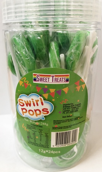 These delicious apple flavoured green swirl lollipops will be a favourite amongst guests at any occasion! With 24 in a pack, they're easily coordinated with the rest of our confectionery and party supplies for your complete party planning needs! Lollipops measure approx. 14cm in total height (including stick) and confectionery part of lollipop measures approx. 4cm in diameter. Lollipops are individually wrapped. Colour may vary slightly from image.