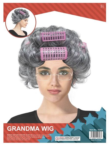 Featuring classic grey colour, short layered curled style and 3 pink plastic rollers you will be rockin' the gorgeous granny look in no time!