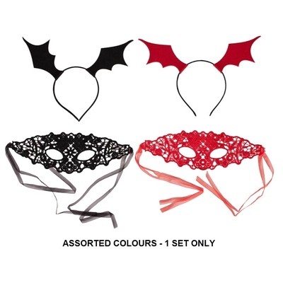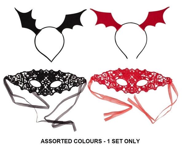 Each set conatins 1 fabric lace eyemask with ribbon ties and 1 headband with attached felt batwings.
