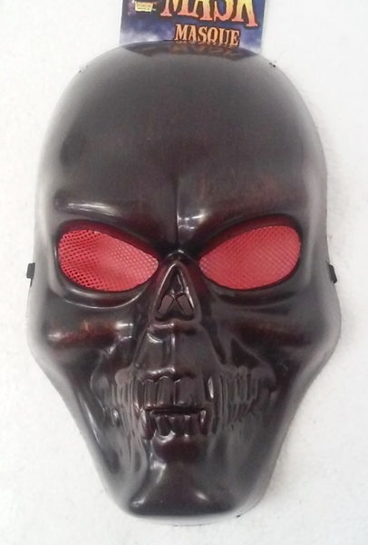 Bronze / black skull plastic face mask - perfect for any Halloween celebration! Designed to fit most adults. Elastic strap attached. Eye holes have a red fabric (with holes in it) covering them, which can be seen through.