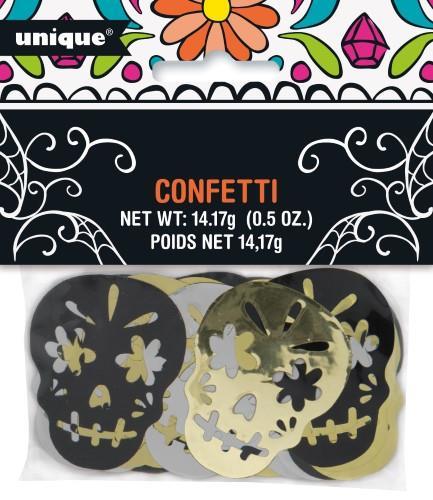 Day of the Dead style foil skull confetti. 14g in a pack. Each piece of confetti measures approx. 3.5cm x 5cm. Skulls are black, gold and silver.