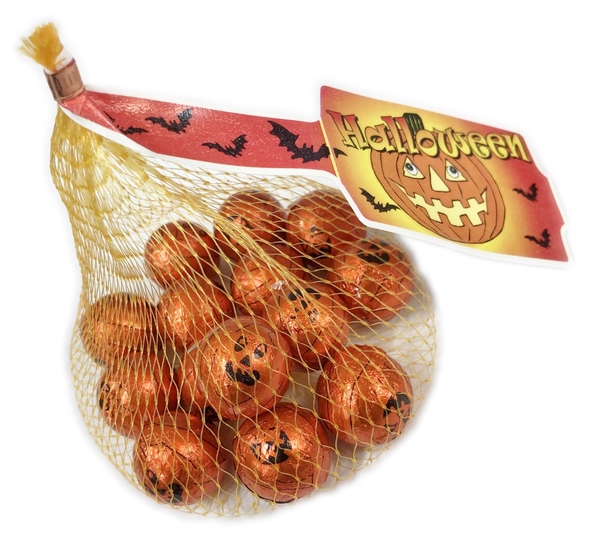 - Milk chocolate balls covered with orange foil with black pumpkin face print