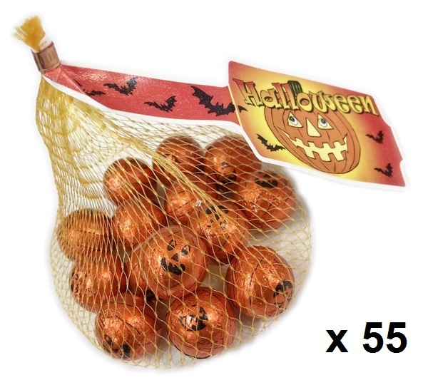 - Milk chocolate balls covered with orange foil with black pumpkin face print