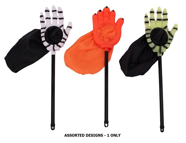 Add a fun element to your/Halloween festivities with the novelty bags featuring a plastic hand with a long handle and hole in the palm measuring approx. 8.5cm diameter with attached polyester loot bag.