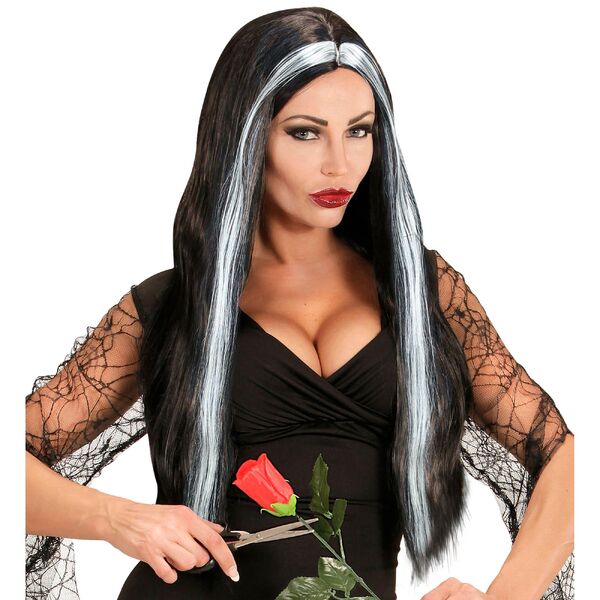 The wig is made from synthetic hair in a long straight black style with white side stripes and centre part, attached to an elastic cap that will stretch to fit most adult heads.