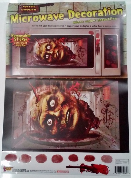 Scary microwave door cover decoration, perfect for any Halloween celebration! Main sticker measures approx. 30cm x 18cm. Simply cut to fit the microwave and stick on.