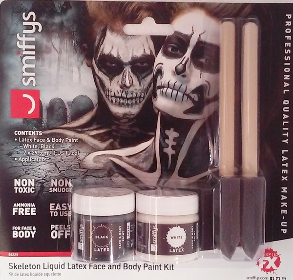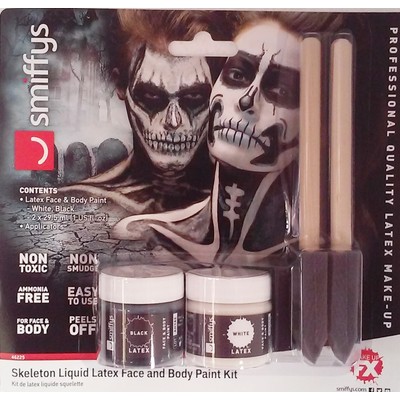 With this skeleton latex face & body paint kit, you'll have no problem achieving a professional look! This kit includes: 2 x applicators and 2 x latex face & body paint jars (white & black - both 29.5ml.) Step-by-step instructions are included as well (to help you become an expert!) Coordinate with our costume items and your costume is bound to be a huge success!