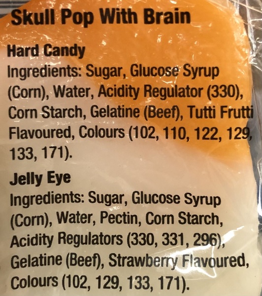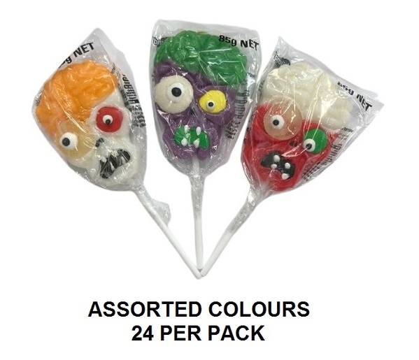 These individually wrapped lollipops feature a gruesome zombie head with brain design and one soft gummy eyeball.