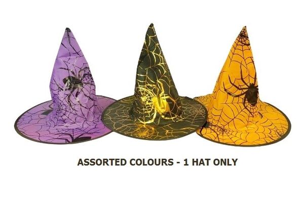 The hat is made from plastic fabric and features an all-over spiders & web print, wired brim and classic cone shape - perfect for parties, trick-or-treating or getting into the Halloween spirit!