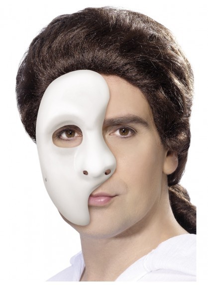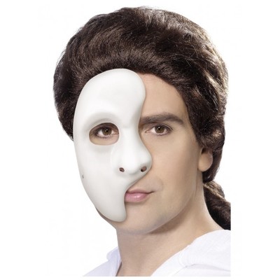 Plastic white half face mask, perfect for any Halloween costume! Designed to fit most adults. Elastic band attached to tie around back of head.