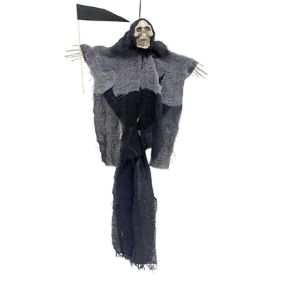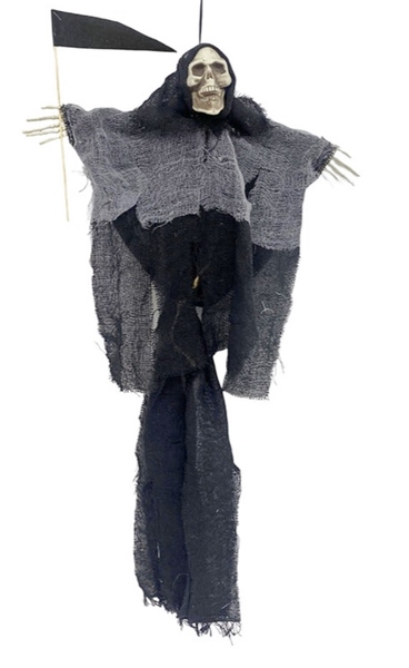 Add a touch of creepy spookiness to your Halloween decor with this Hanging Black Reaper Halloween Decoration!
