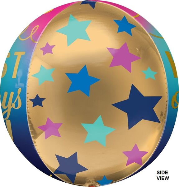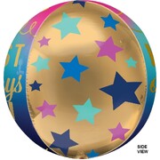 This balloon inflates to be round like a beach ball and features a 'Happiest of Birthdays To You' message on the front & back panels and gold & stars print on the sides.