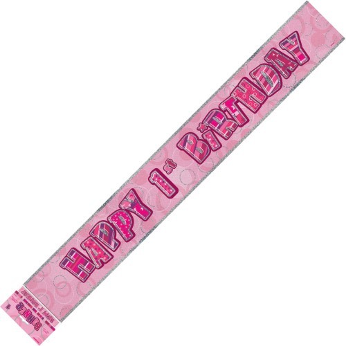Happy 1st Birthday glitz pink foil banner, measuring approx. 3.6m in length x 13cm in width.