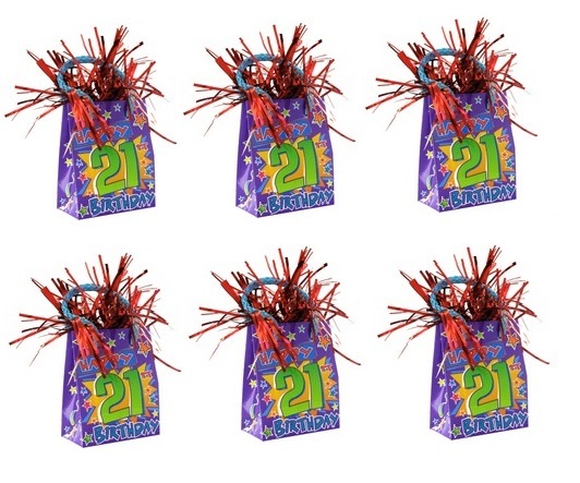 This 6 pack of Happy 21st giftbag shaped balloon weights is perfect for any 21st party! Used for the weighing down of helium balloon arrangements, they can also be used as a table decoration with picks! Each weight can hold down approximately 10 x 28cm latex balloons.