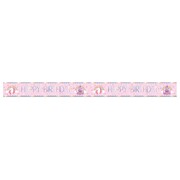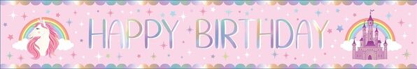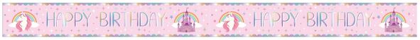 Featuring a pink background, sparkling iridsescent silver 'Happy Birthday' wording and edging and lovely castle & unicorn decals, the banner measures approx. 174 cm long x 15cm wide. The whole design is repeated twice along the length.