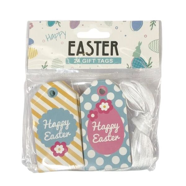The pack includes 24 cardboard gift tags in 3 designs with pre-punched hole & 24 white ribbons.