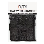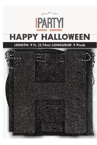 Made from sturdy cardboard, the individual black glitter letters are pre-threaded onto black/white twine making this banner quick & easy to display.
