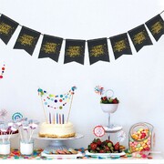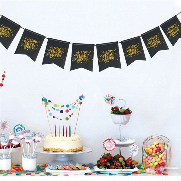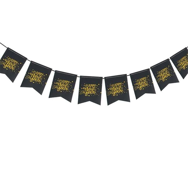 The pennants feature a black background with gold glitter 'Happy New Year' wording and pre-punched holes for easy assembly.