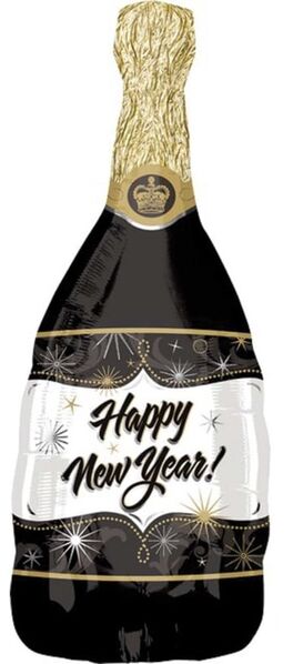 This shaped foil balloon features a champagne bottle design with a black cursive 'Happy New Year' message.